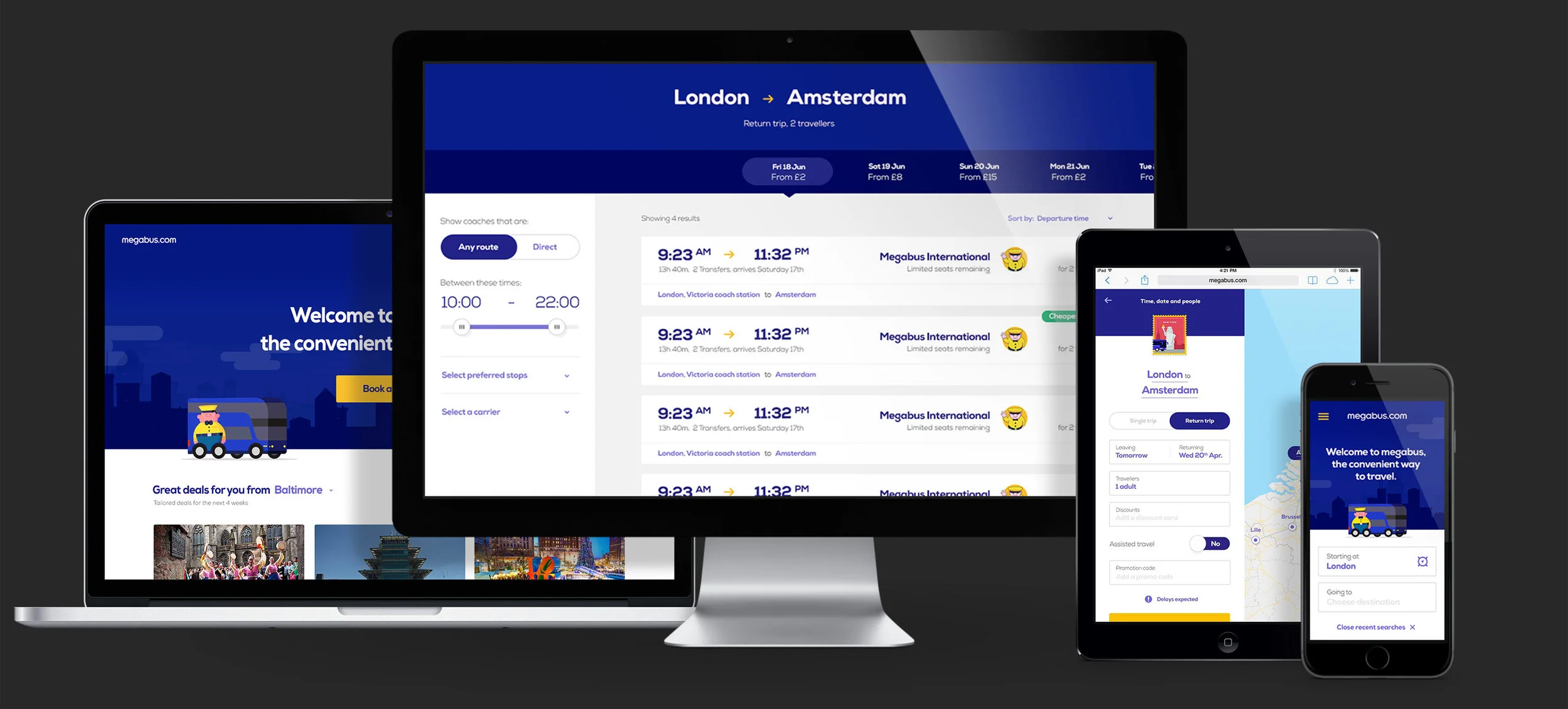In 2015, coinciding with a bigger push into the European mainland markets, Stagecoach partnered with Huge to redesign and expand the digital offering for megabus. To stand out from a field of competitors, who all compete on price, megabus.com needed to deliver an experience that set them apart.